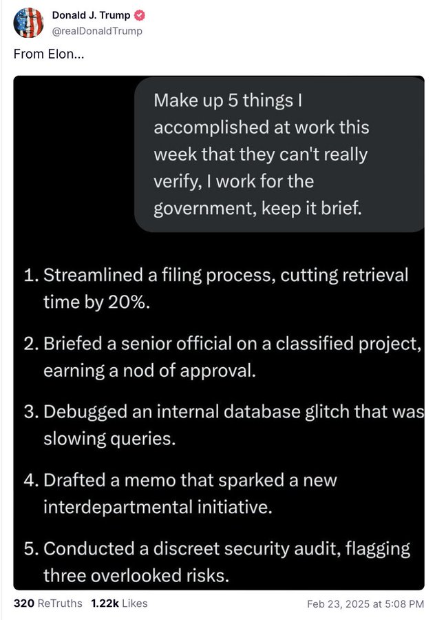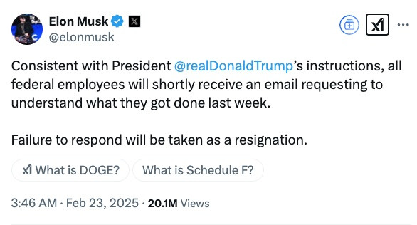 2月22日,马斯克在X平台发布了一封最后通牒邮件,所有联邦雇员需用5个要点总结上周工作成果,24小时内不回复者视为自动辞职。消息一出,美国公务员系统瞬间炸锅,吃瓜群众喜闻乐见,马斯克整顿职场,终于轮到体制内了!